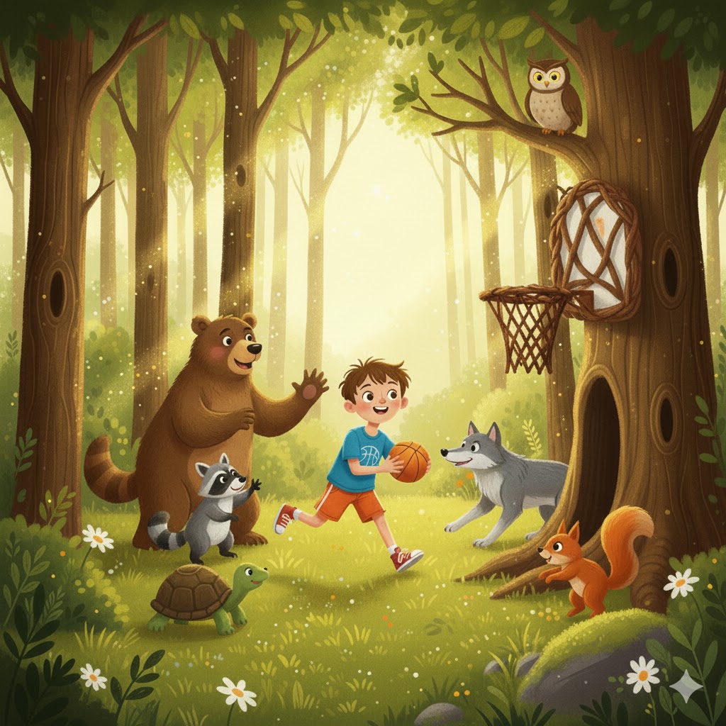 Utakmica je počela. Medved Meda Medić čuvao je koš, veverica Mica je trčala brzo kao vetar, rakun Uško je precizno dodavao, vuk Janko je pazio da svi igraju pošteno, a kornjača Miki je strpljivo čekala pravi trenutak. Dimitrije je bodrio sve i radovao se svakom dobrom potezu.