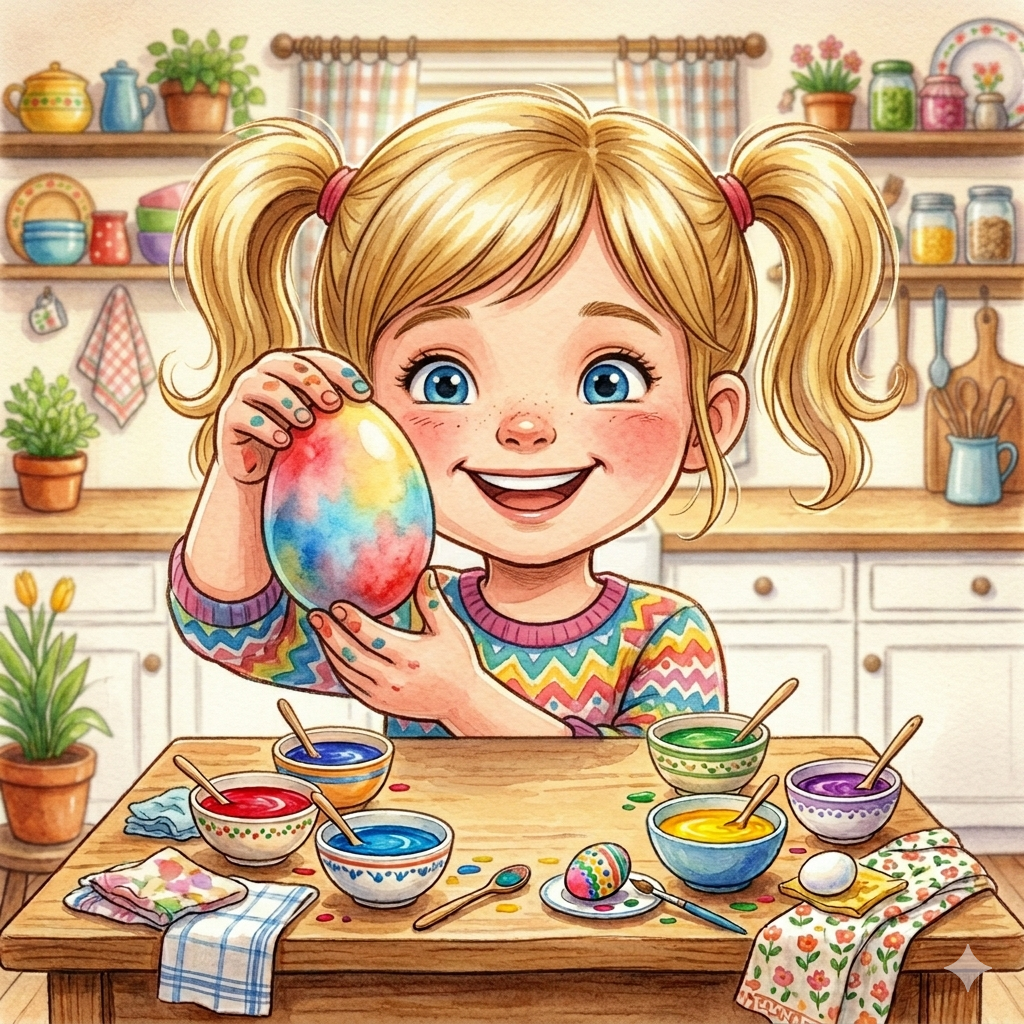Na stolu su bile činije sa bojama — crvena, plava, žuta, zelena i ljubičasta. Pored njih su bila bela jaja, uredno složena.