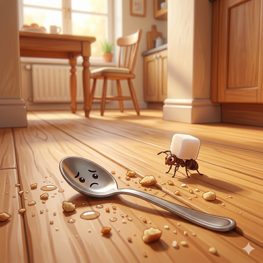 Sunce je provirilo kroz prozor i nežno zagrejalo kuhinju. U fioci, među viljuškama i noževima, ležala je mala kašičica po imenu Kaša. Protegla se i zevnula.