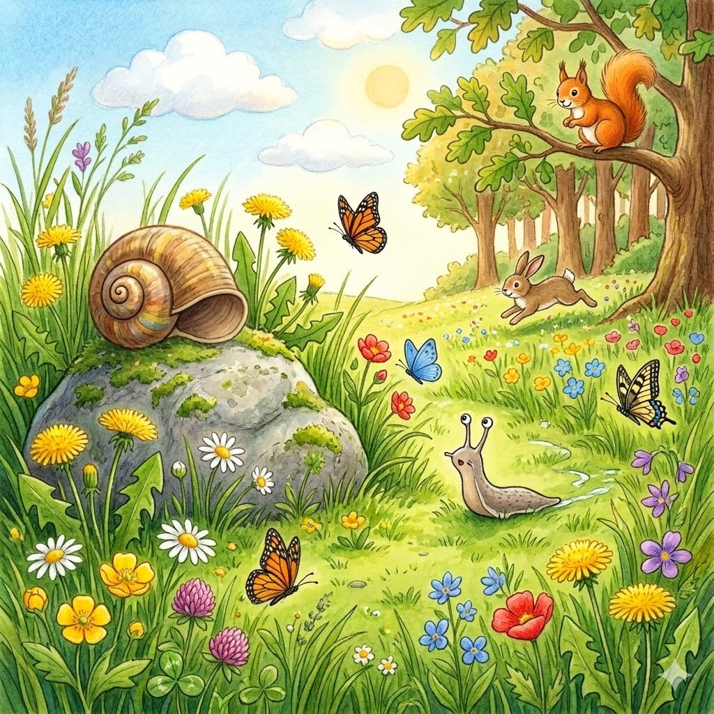 Jednog lepog prolećnog jutra, na livadi punoj maslačaka, živeo je mali puž po imenu Slavko.