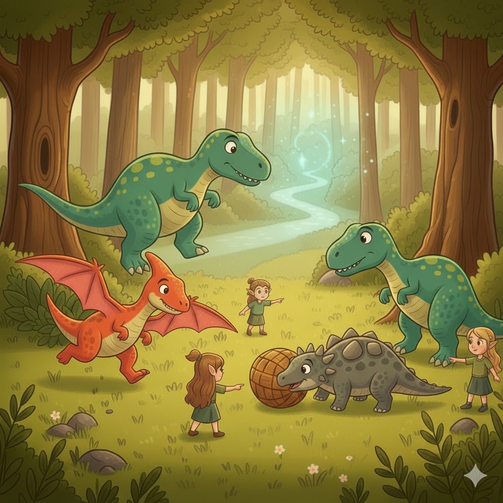 Vilenjaci su se nasmešili i poveli dinosauruse kroz šumu. Pokazali su im veliku, zelenu čistinu iza starog hrasta.